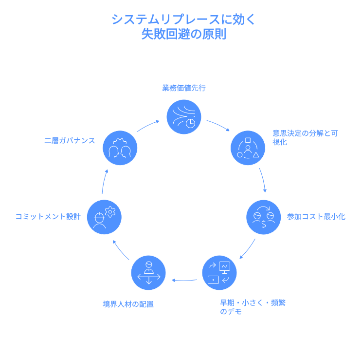 原則6:コミットメント設計。関与の仕方を役割ごとに明文化し、週次の“儀式”(ステアリング、デモ、設計クリニック)に紐づける。参加・不参加の影響を事前合意し、決定が流れない仕組みにします。