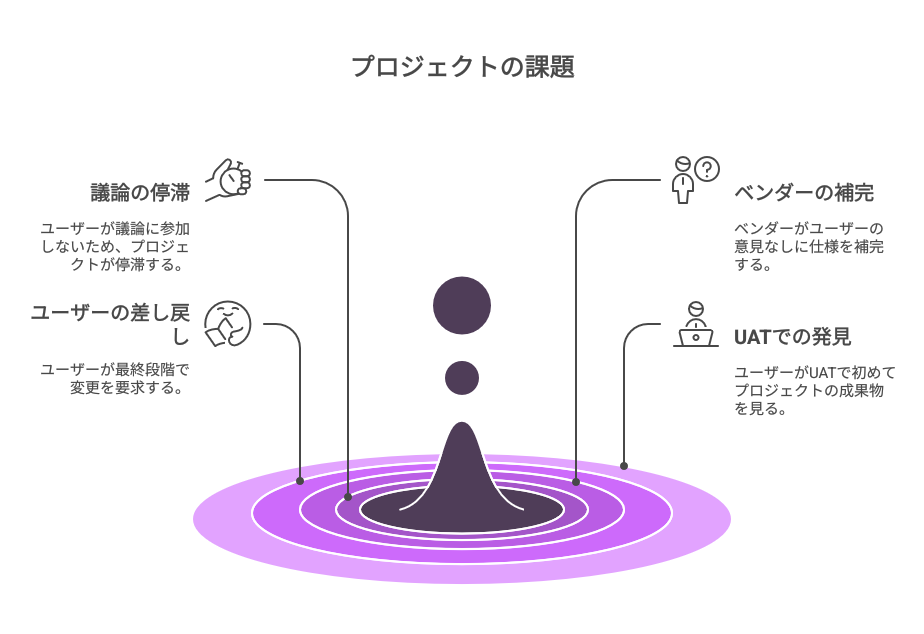 ユーザー部門が要件定義に出てこない。出ても「忙しい」「前例がない」で議論が進まない。ベンダーが善意で仕様を補完するが、最後に「そんなつもりではなかった」と差し戻し。期日が迫り、プロジェクトは「UATで初めて実物を見る」状態に陥ります。