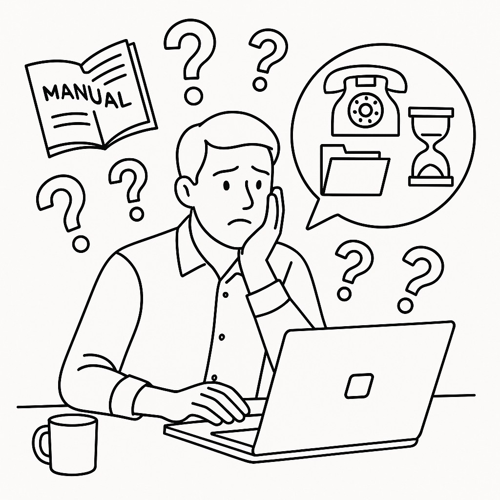 よくあるのは、マニュアルが「画面の説明書」になっているケースです。現場のタスク(例:月末の請求処理)に沿っていないため、何をどの順にやるかが分からない。しかも検索できず、更新日も不明で、どれが最新か判断がつきません。