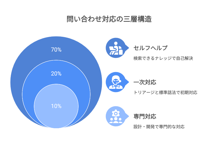 設計の骨格は三層です。S0(セルフヘルプ:検索できるナレッジ)、S1(一次対応:トリアージと標準話法)、S2(専門対応:設計・開発)。S0が7割、S1が2割、S2が1割という設計目安を置き、毎週測って調整します。目標配分を持つだけで、改善の力点が定まります。