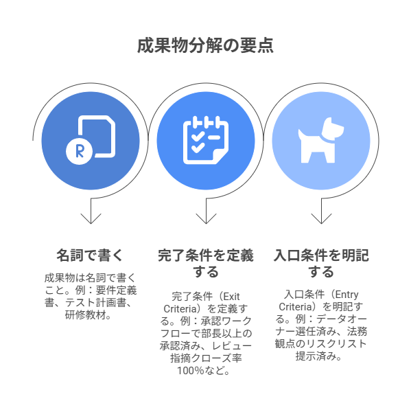 成果物分解の要点は3つです。1つ目は名詞で書くこと(例:要件定義書、テスト計画書、研修教材)。2つ目は完了条件(Exit Criteria)を定義すること(例:承認ワークフローで部長以上の承認済み、レビュー指摘クローズ率100%など)。3つ目は入口条件(Entry Criteria)を明記すること(例:データオーナー選任済み、法務観点のリスクリスト提示済み)。この「入口・出口」のセットが、品質と進捗の双方を支えます。