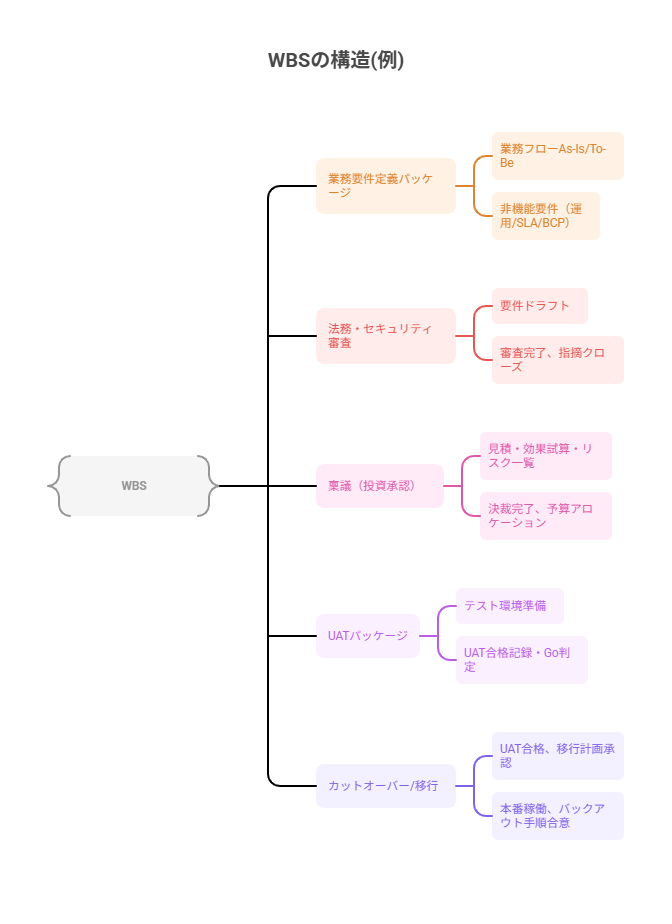 具体例として、要件定義のWBSをもう一段崩しましょう。業務フローTo-Beは、関係部署ヒアリング→ドラフト作成→レビュー会→合意形成→承認ログ化、の5つに分けると1〜2週間で完了できます。非機能要件は、運用体制案作成→SLA案→監視/アラート要件→BCP/DR要件→レビュー/承認と分けると漏れが減ります。これらは全て「承認記録(Exit)」を伴わせておくことが重要です。