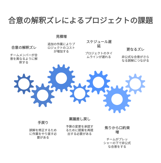 - 合意の解釈ズレ→手戻り→見積増→稟議差し戻し→スケジュール遅延→焦りから口約束増→更なるズレ。