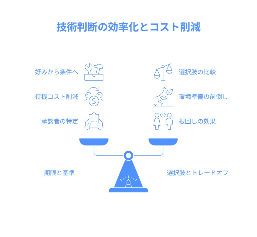 - 技術判断の遅延は「決める仕組みの不在」が原因です。業務側が期限と基準を用意し、週次で決裁するだけで手戻りは激減します。