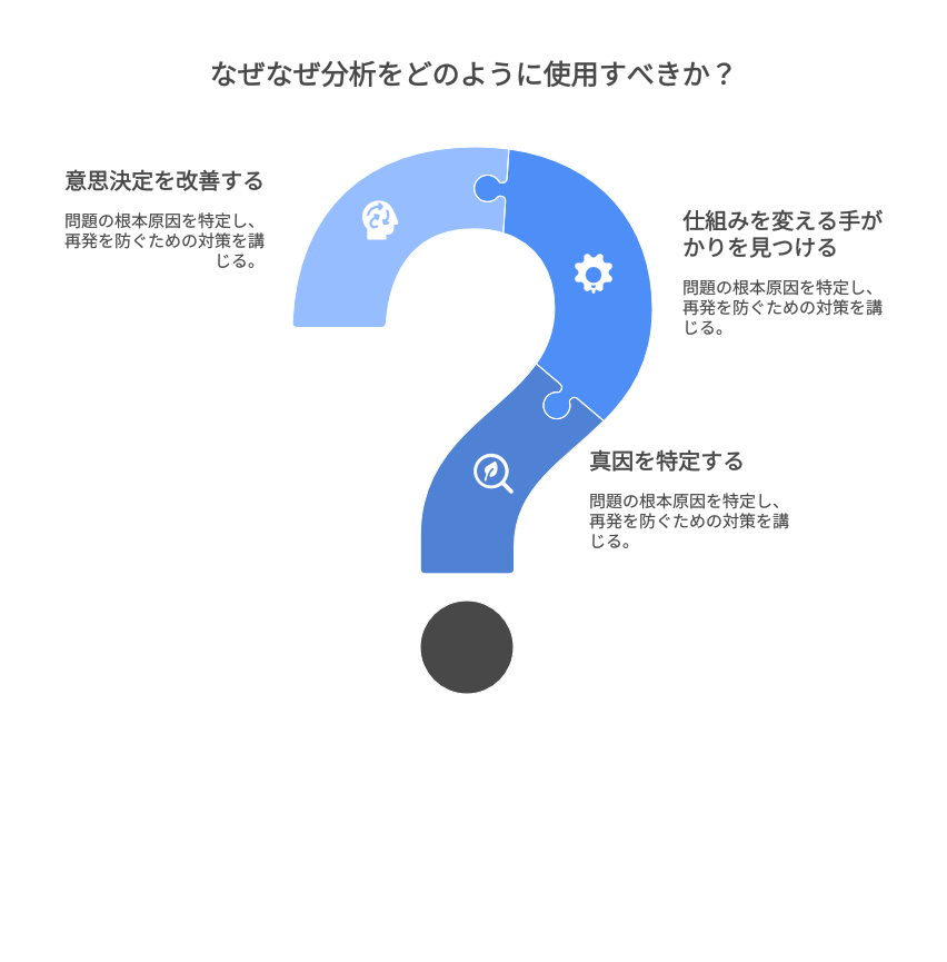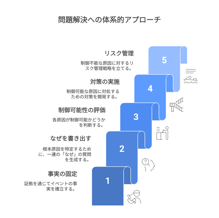 なぜなぜ分析が効く理由は、説明責任の構造を整えるからです。多くのトラブルは複合要因で起きますが、上層部には「全体像」「再発防止の筋の良さ」「費用対効果」が伝われば十分です。5回の「なぜ」を通じて、現場の事実を因果でつなぎ、可視化可能な対策に落とす過程自体が、意思決定者への説得材料になります。結果だけでなく、たどり着いた思考の道筋を示せるのが強みです。